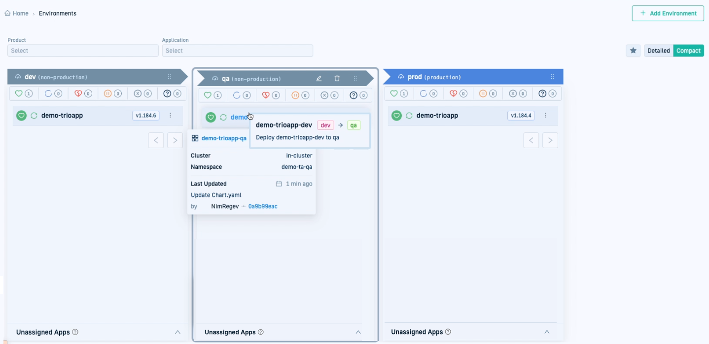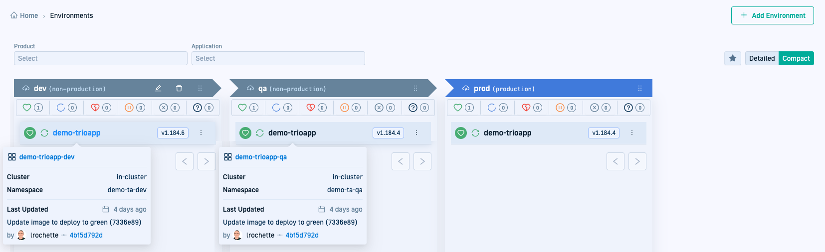 demo-trioappproduct is displayed in thedev,qa, andprodenvironments. - Note the release versions for the product in each environment.