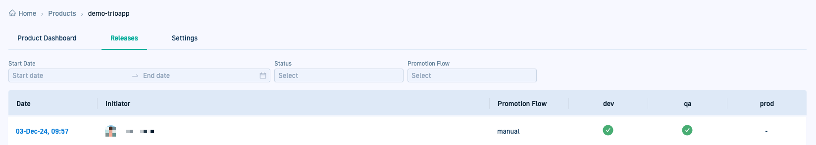 After committing the changes, the promotion mechanism automatically creates a release for the product, demo-trioapp in our example.