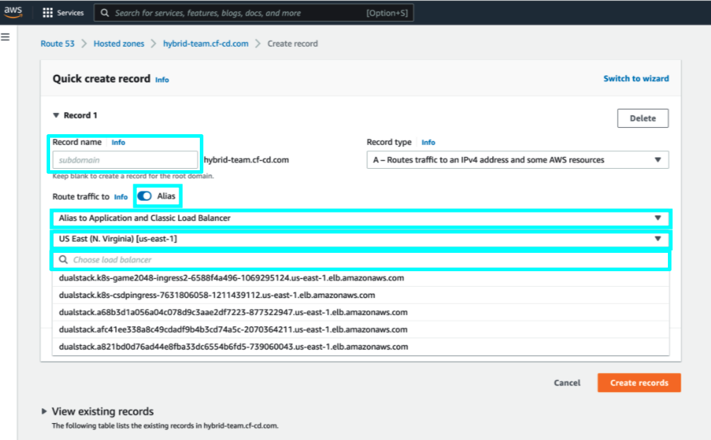 - After Hybrid GitOps Runtime installation, in Amazon Route 53, create an alias to route traffic to the load balancer that is automatically created during the installation: