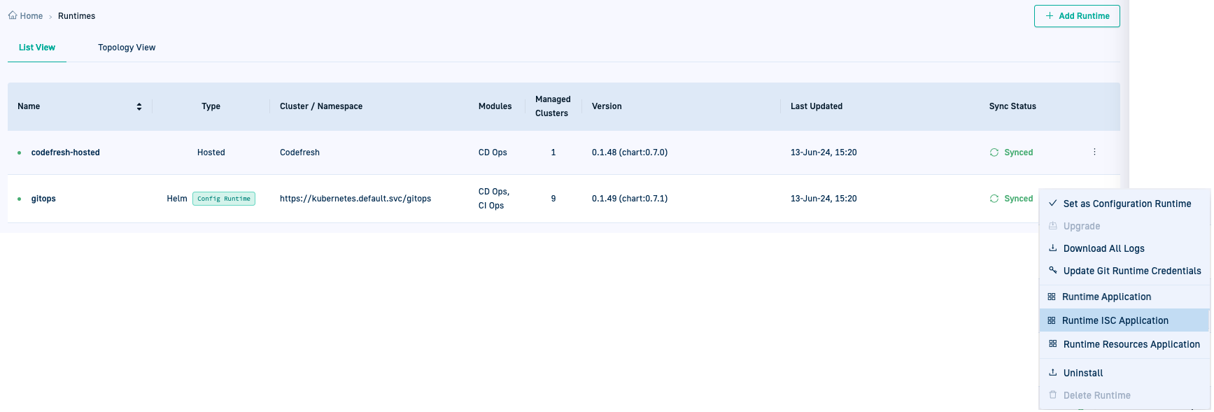 Select the Runtime ISC Application option from the Runtime’s context menu.