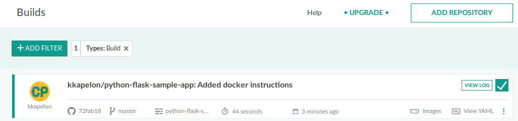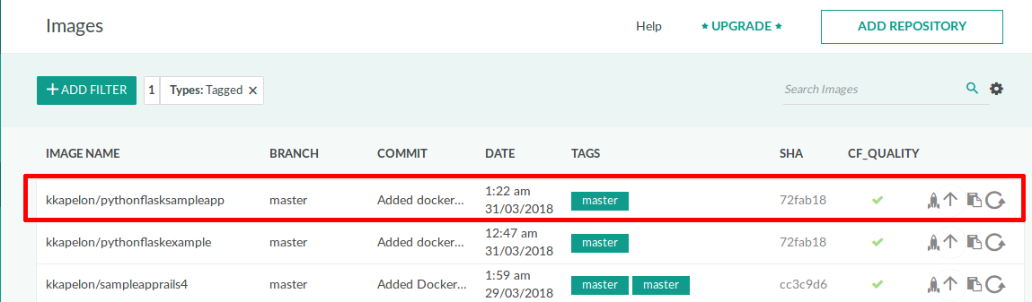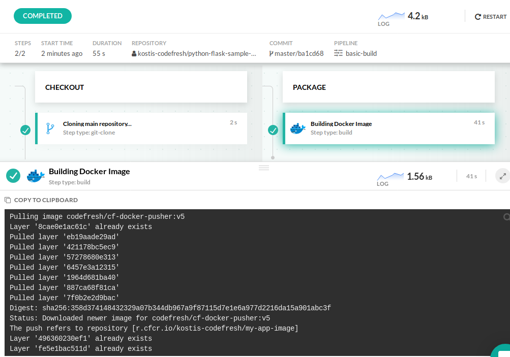 Codefresh has the unique feature where the build step that creates the Docker image, also automatically pushes the image to your default Docker registry! All the images that we have created so far, are stored in the registry you connected at the beginning of the quick start.