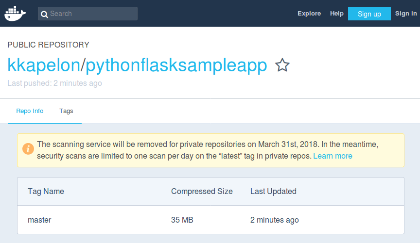 To verify the latter, visit your profile in Docker Hub and look at the image details:
