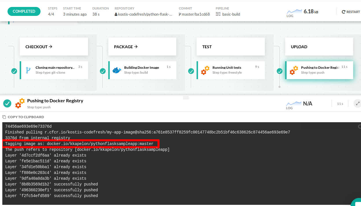 - Click the Pushing to Docker registry step to view the log and monitor the progress of the push step.