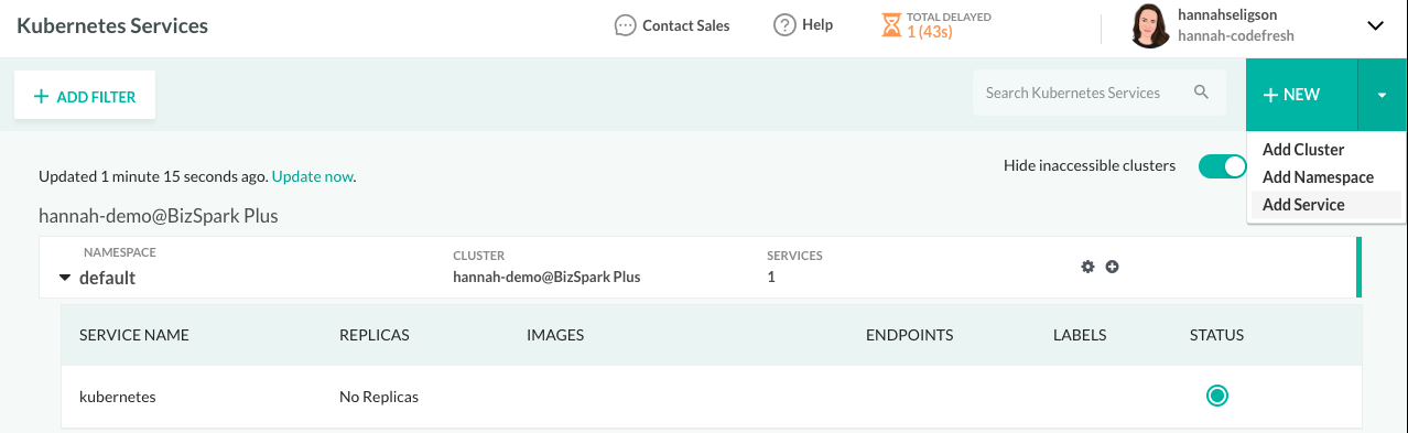 Codefresh displays the deployments (pods and namespaces) in your Kubernetes cluster. - On the top-right, click New, and then select Add Service.