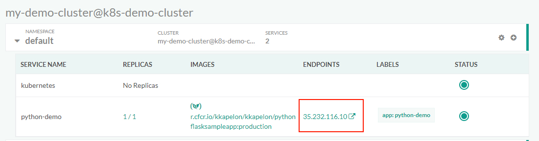- Click Deploy. Codefresh creates a Kubernetes YAML file behind the scenes and apply it to your Kubernetes cluster.