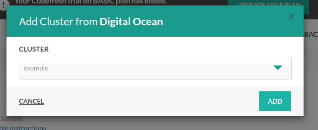 Next, expand the DigitalOcean row from the triangle icon on the right and click on the Add cluster button. The drop-down menu should contain all your DigitalOcean Kubernetes clusters. Select the one that you want to connect into Codefresh and click the Add button.