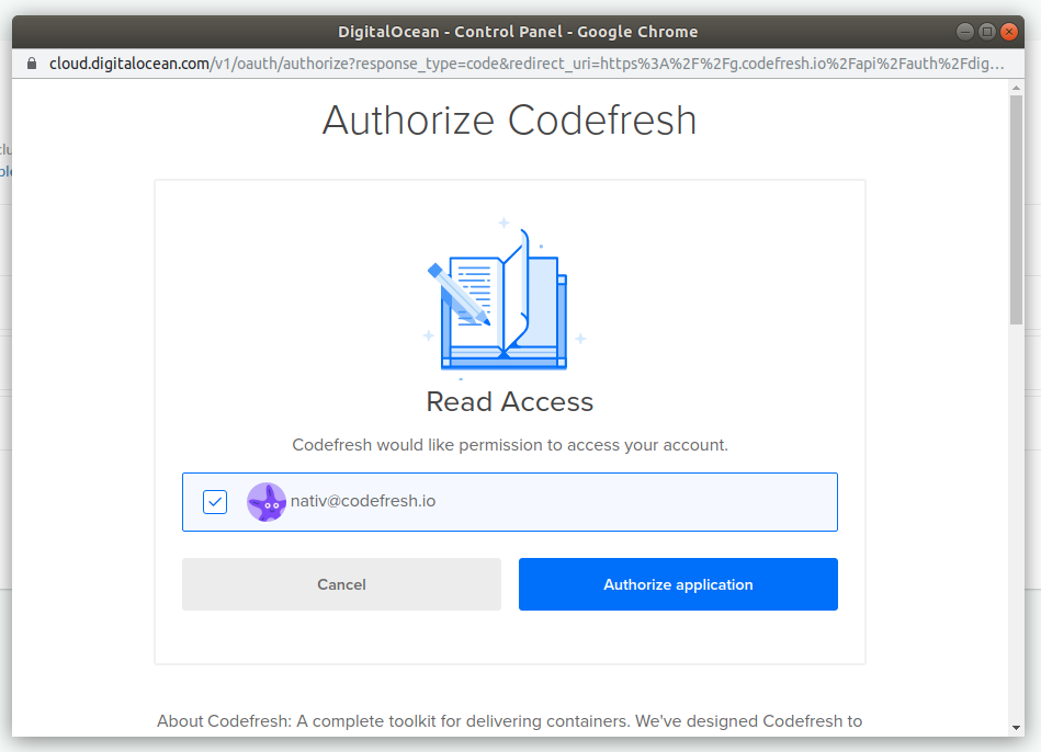 Click on the checkbox next to your account name and select the Authorize application button. Codefresh has now access to your DigitalOcean cluster. You need to authenticate only once.