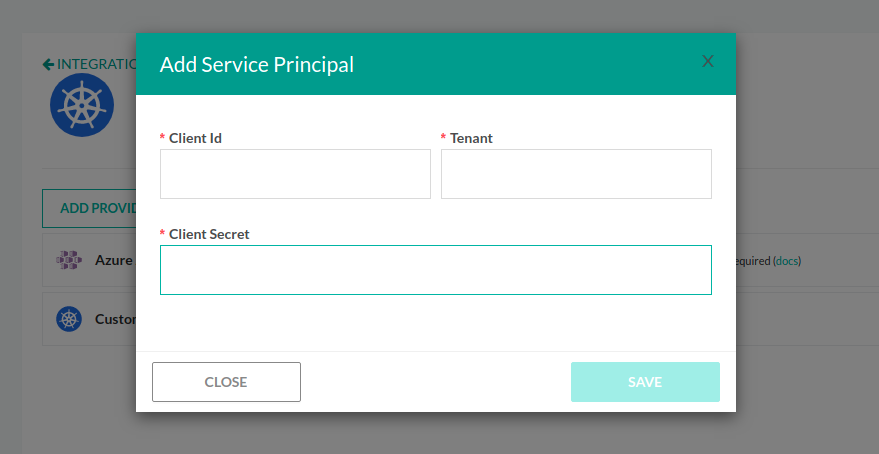 An alternative method of adding an Azure cluster is by using a service principal (Azure AKS SP).