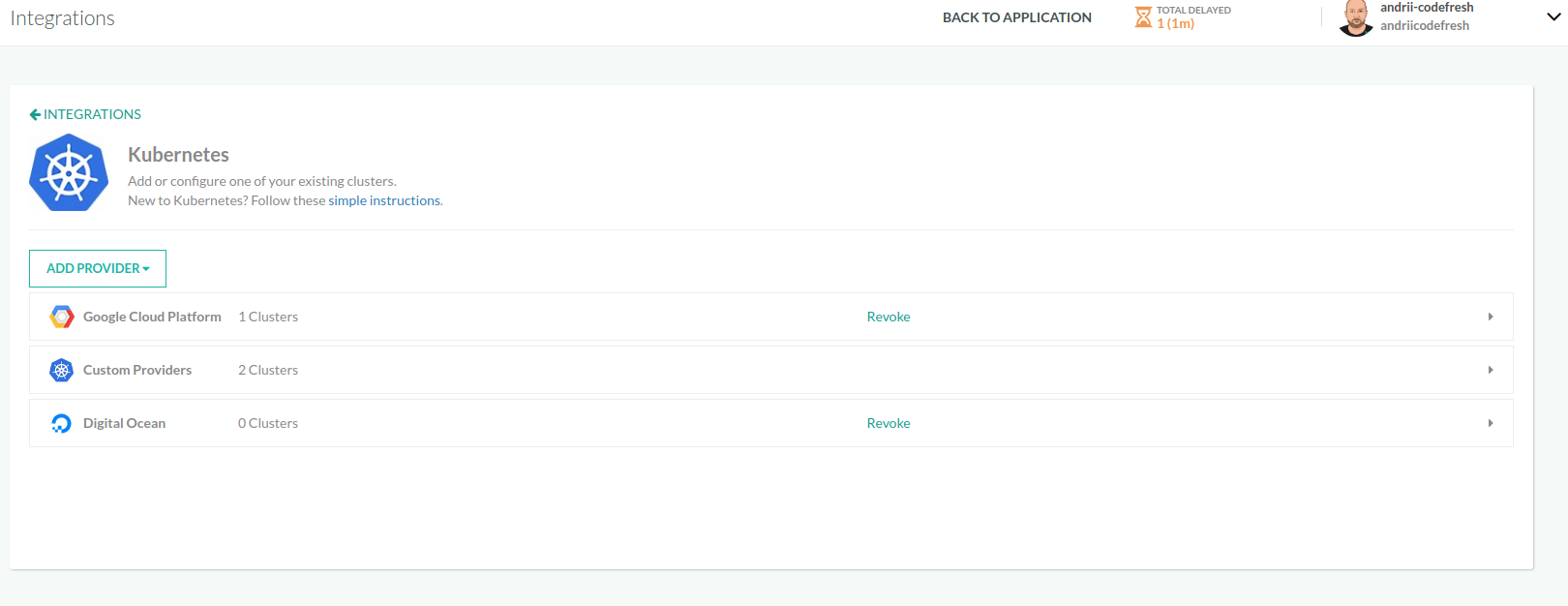 If you wish for any reason to revoke the granted access from the Azure side, visit https://account.activedirectory.windowsazure.com/r#/applications and remove “Codefresh” from the list.