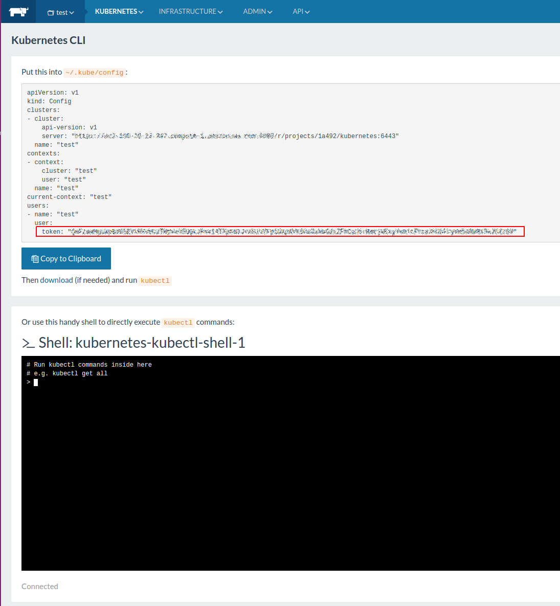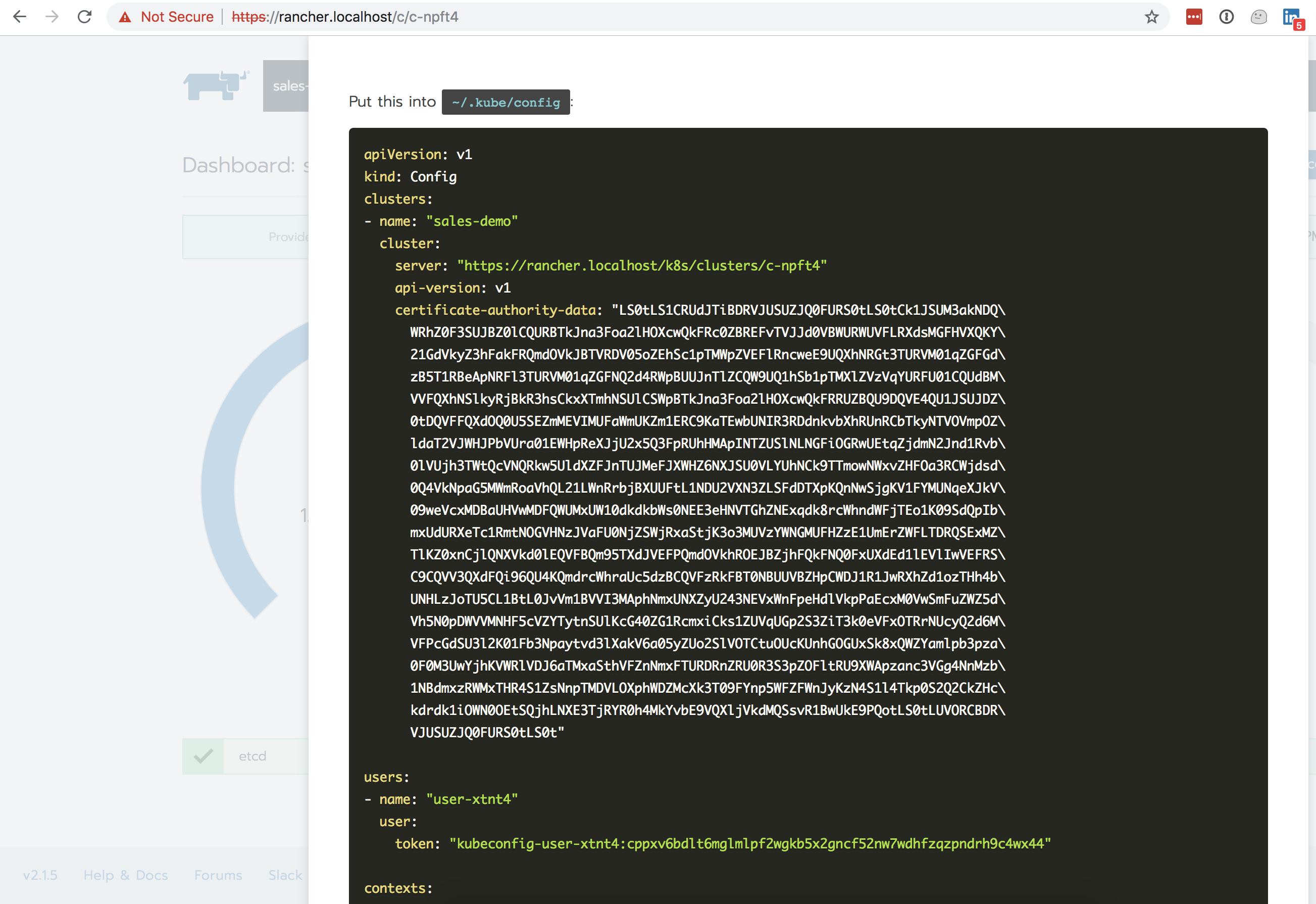 https://rancher.localhost/k8s/clusters/c-npft4. - The token should be taken from the kubeconfig provided by Rancher under user -> token section of YAML and it has to be encoded with base64 before putting it into Codefresh. Be careful with the ‘\n’ characters when encoding, do not wrap token in quotes when running echo command. The command for Linux is: