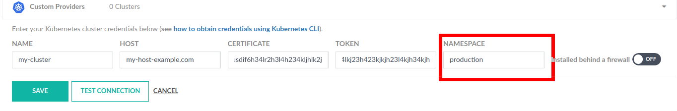 - The token should be taken from the kubeconfig provided by Rancher and it has to be encoded with base64 before putting it into Codefresh. Be careful with the ‘\n’ characters when encoding. The command for Linux is: