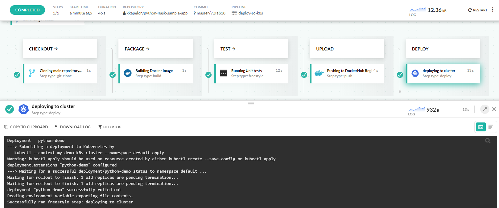 You can also deploy to a cluster in a pipeline. Codefresh offers several ways for Kubernetes deployments. The important point here is that all connected clusters are automatically available to all pipelines with their unique name as a kubectl context.