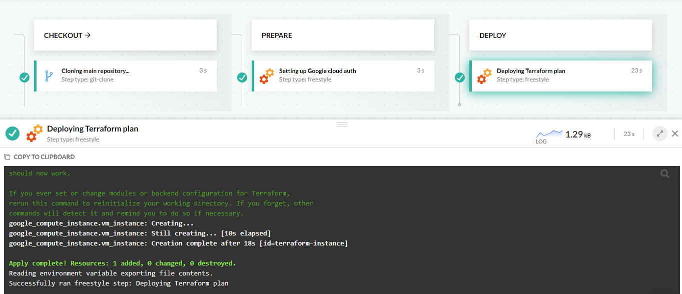 Note that in a production pipeline you should also handle the Terraform state in a proper manner. The example provided is using a file for state storage which is not appropriate when using Terraform in a team environment. Instead you should use one of the storage backends that support High Availability and Locking.