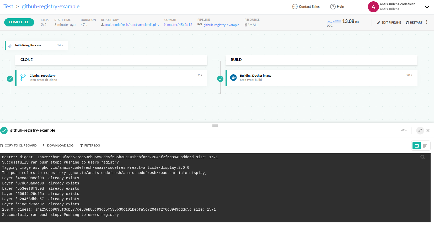 With the registry integration in place, you can now push a Docker image in any Codefresh pipeline, simply by mentioning the registry by name (github-container-registry in the example).