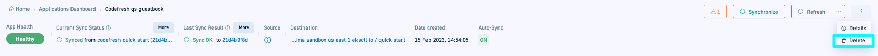 Delete an Argo CD application from Codefresh. Deleting an application deletes the manifest from the Git repository, and then from the cluster where it is deployed. When deleted from the cluster, the application is removed from the GitOps Apps dashboard in Codefresh.