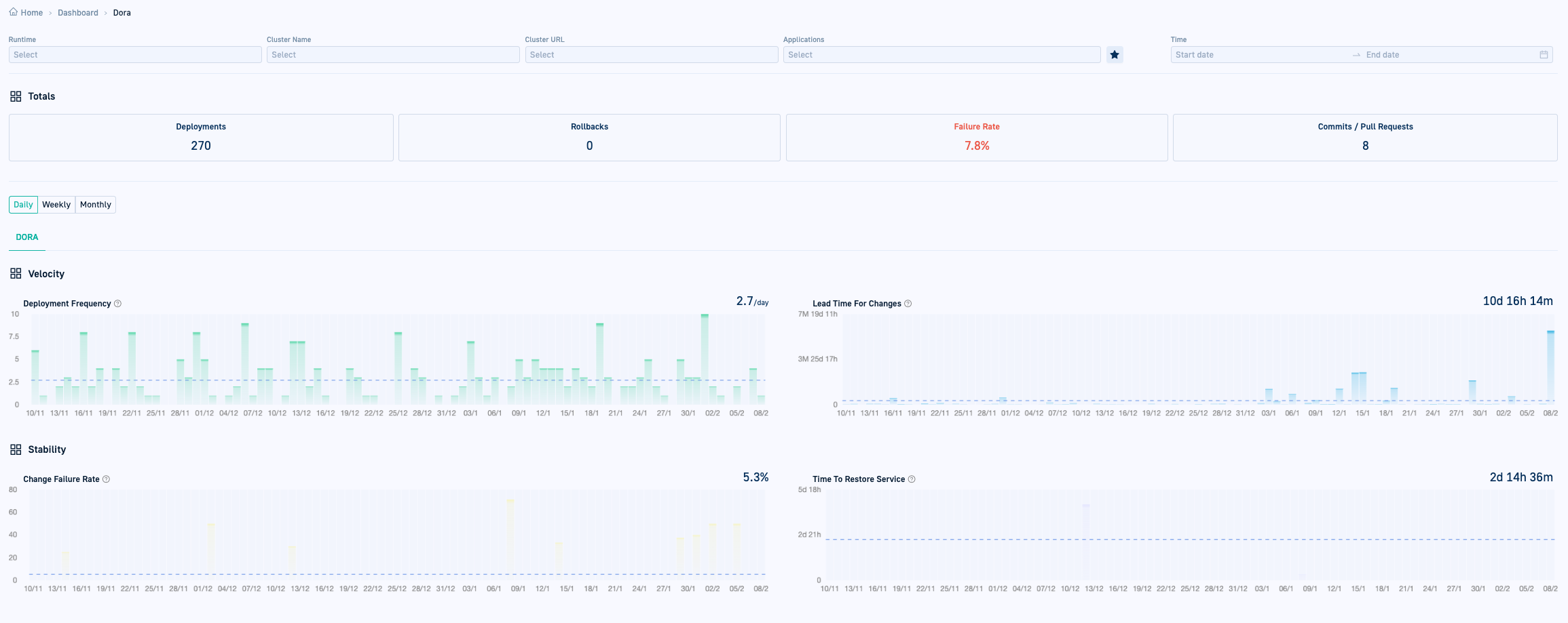 The metric graphs are key to performance insights with DORA metrics. The metrics are again based on the filters defined, or for the last 90 days if there are no filters.