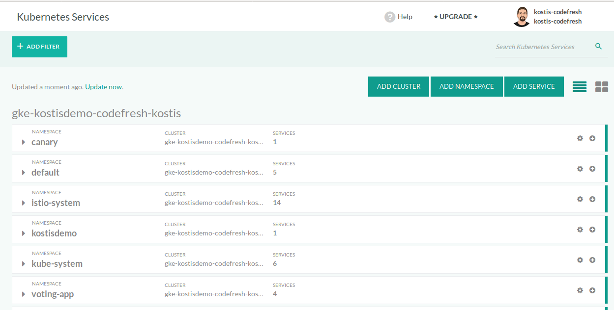 pod "codefresh-kostis-kube-agent-86dbcc67c4-9gqqb" deletedOnce the command is run, you can visit the Codefresh Kubernetes dashboard and you will see your Google Cloud cluster already configured.