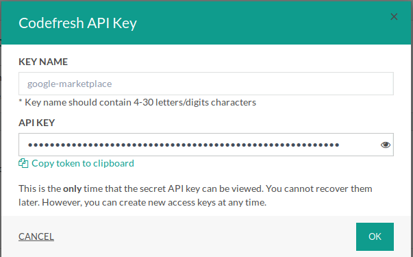 - Key Name: Enter the name of the key, preferable one that will help you remember its purpose. The token is tied to your Codefresh account and should be considered sensitive information.