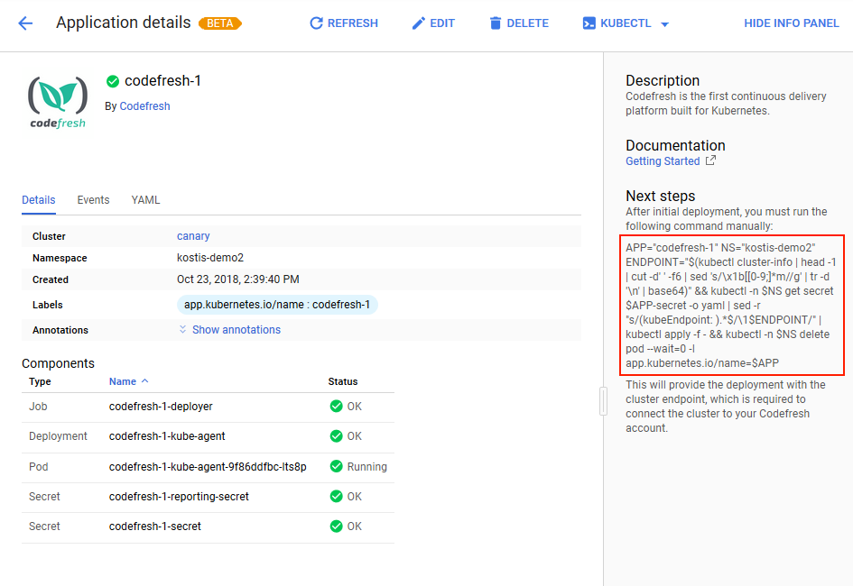 - Note down the namespace you used, as it becomes important later on inside the Codefresh UI.