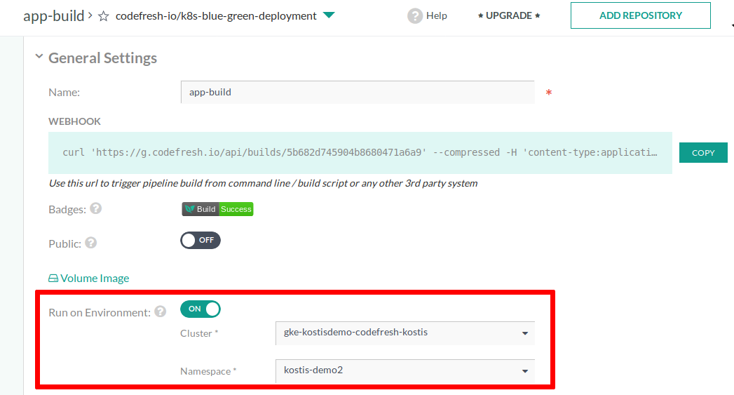 Open any Codefresh pipeline and toggle the Run on Environment switch. Select the cluster and the namespace that you used for the installation in step 2.