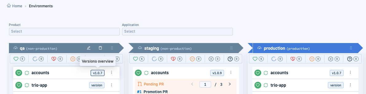 Environments provide visibility into which applications are running where. If you have created products to group applications, environments display the products, and their associated applications. If there are no products, the dashboard displays individual applications.