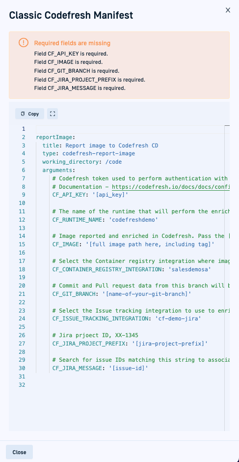 Codefresh validates the generated manifest, and alerts you to undefined arguments that are required, and other errors.