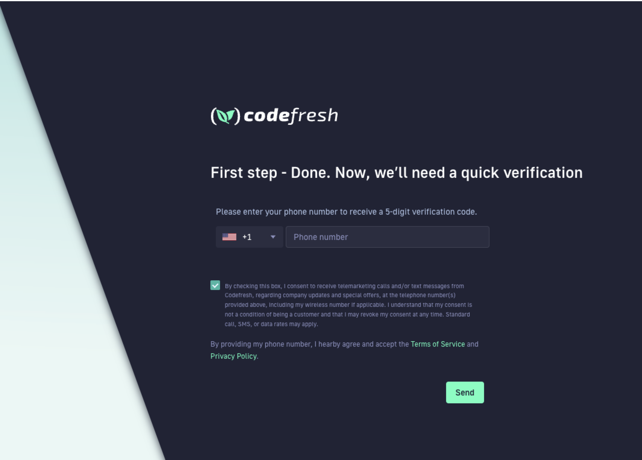1. Select the required country code, enter your phone number, and then click Send.