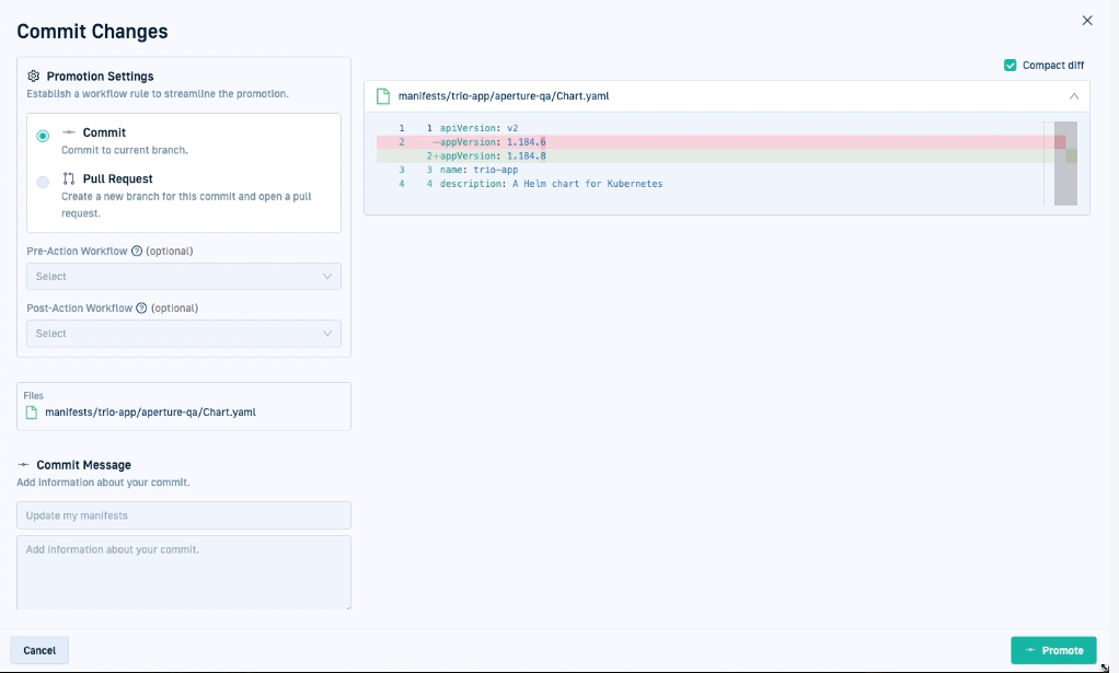 The Commit Changes page displays details about the promotion, including the action used, the files impacted, and the properties being updated.