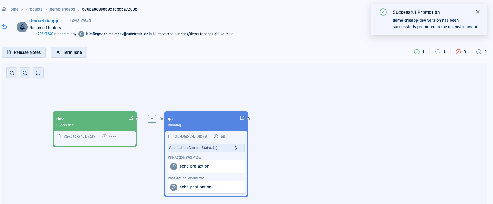 In this quick start, we’ll promote changes in demo-trioapp-dev to demo-trioapp-qa across their respective environments.