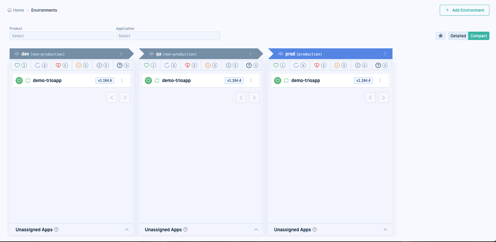 demo-trioappproduct is displayed in thedev,qa, andprodenvironments. - Note the release versions for the product in each environment.