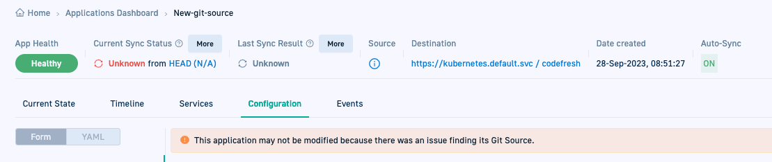 - You cannot modify the application’s settings nor delete the application in Codefresh. The UI displays a notification that “there was an issue with the application’s Git Source.”