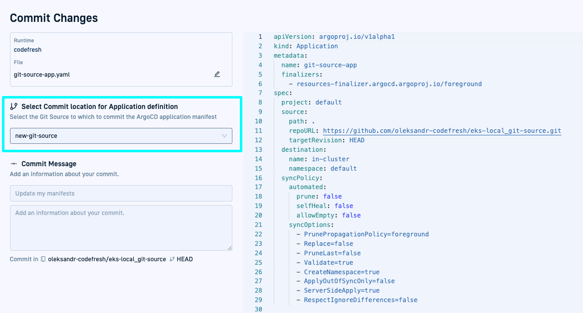 When creating an Argo CD application in Codefresh, selecting the Git Source to which it should sync is a critical step before committing the application manifest.