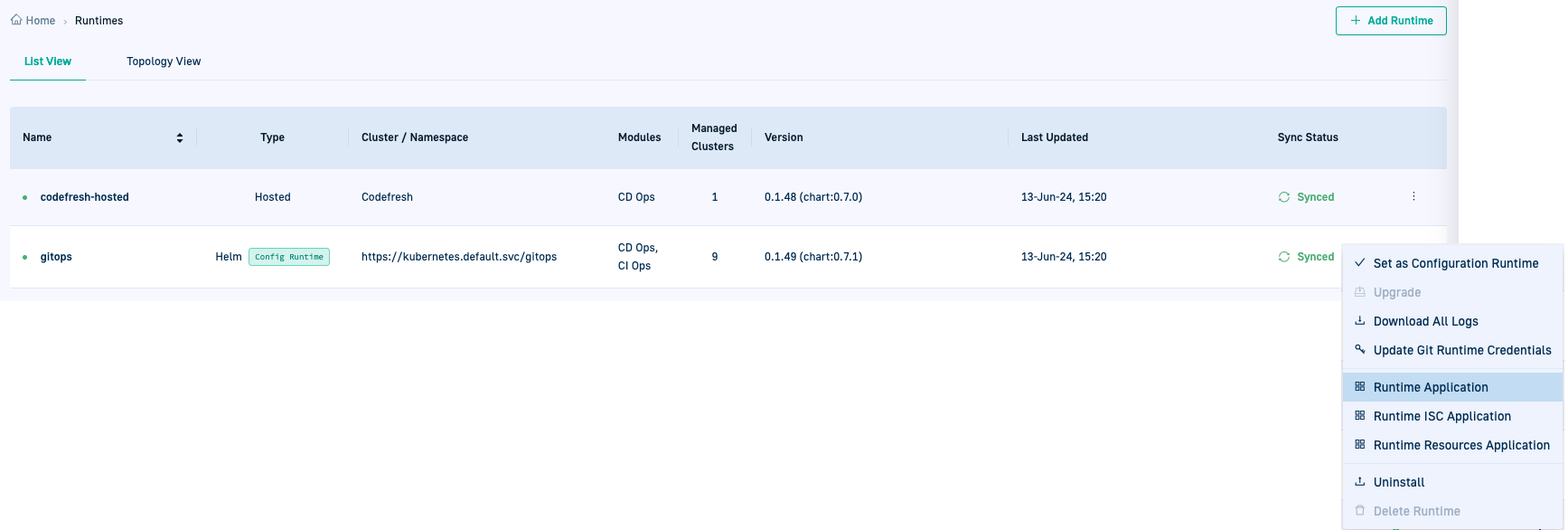 The Runtime’s context menu now includes the Runtime Application option, which when selected takes you to the Current State tab in the GitOps Apps dashboard.