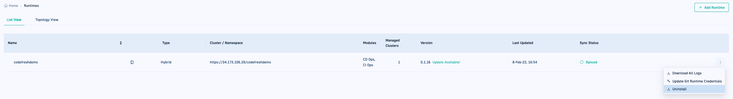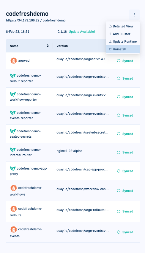 - The Runtime from the Codefresh platform and from the cluster it is provisioned on