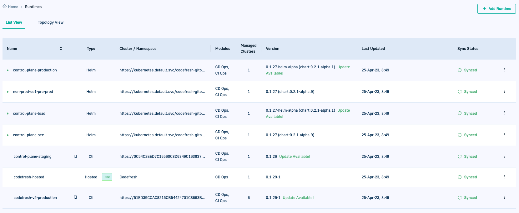 - List view: The default view, displays the list of provisioned Runtimes, the clusters managed by them, and Git Sources associated with them.