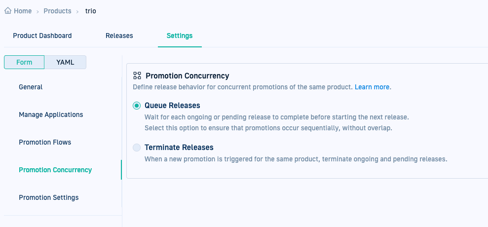 For example, if the ongoing release is currently promoting tostagingand the new release also advances tostaging, the ongoing release is terminated. - Only one release can be active for a product at any given time.