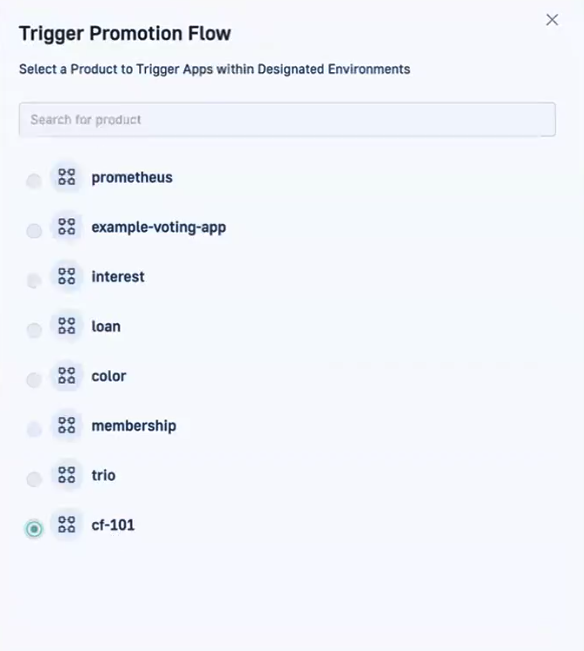 - Ensure that the selected product has applications in all the environments defined in the Promotion Flow