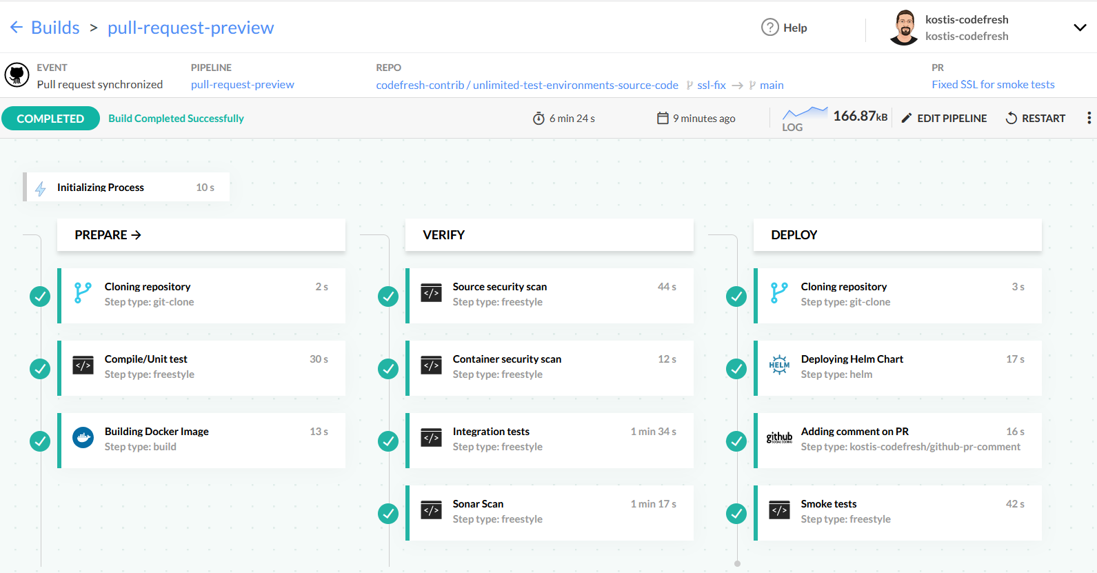 - mvn -Dmaven.repo.local=/codefresh/volume/m2_repository verify -Dserver.host=https://kostis.sales-dev.codefresh.io/${{CF_BRANCH_TAG_NORMALIZED}}/ -Dserver.port=443The end result of the pipeline is a deployment to the path that has the same name as the PR branch. For