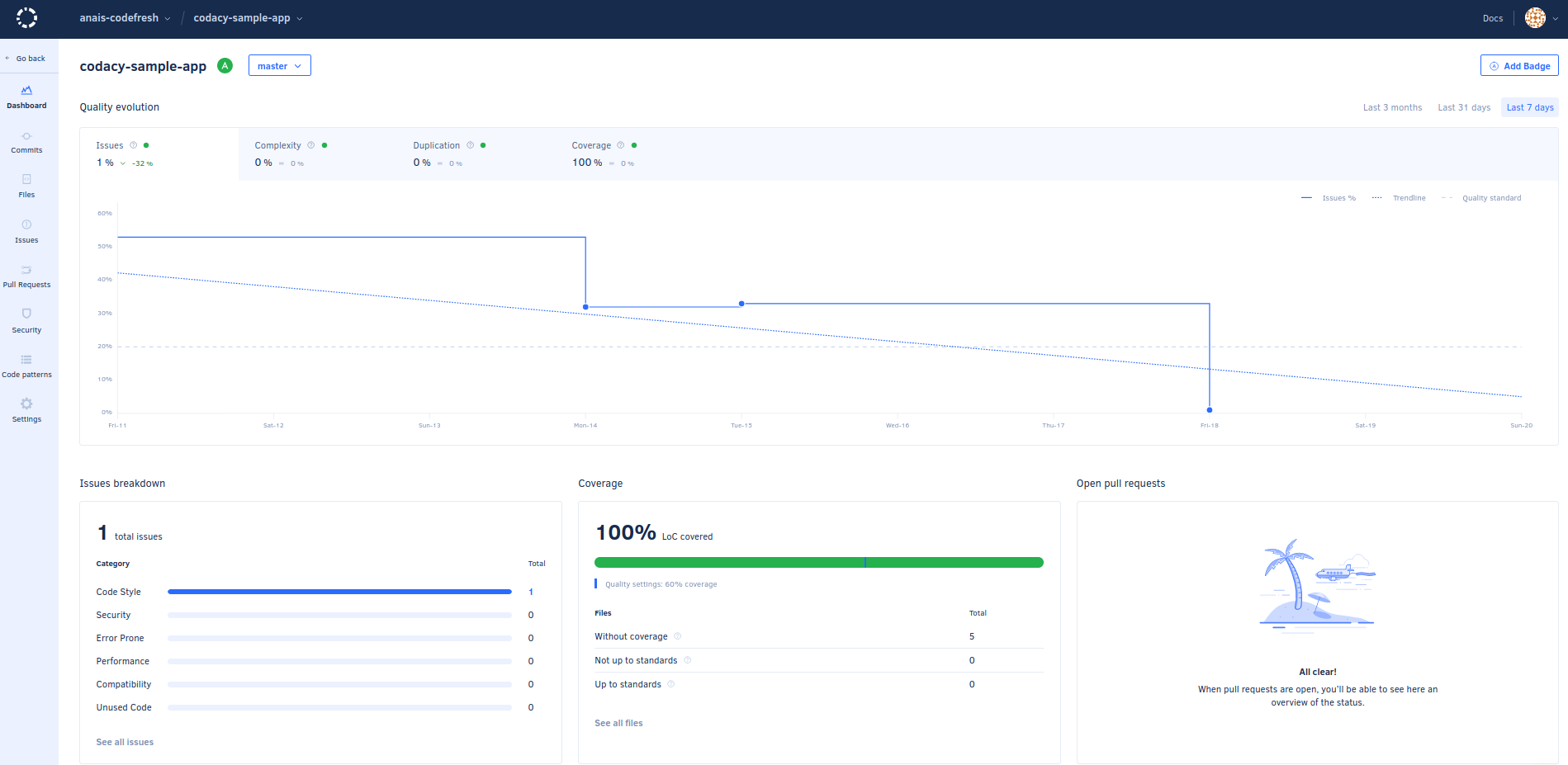 You can view the updated coverage reports within Codacy’s UI every time you make a commit and/or run the Codefresh pipeline directly.