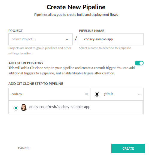 If the project you want to use Codacy in does not have a pipeline, create a new pipeline.