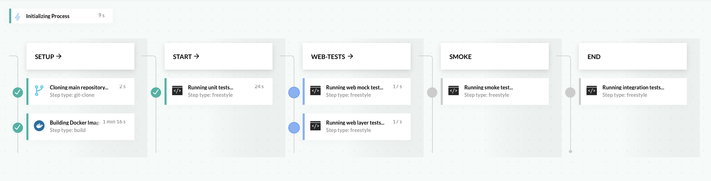 Our pipeline will have five stages: setup, start, web-tests, smoke, and end: