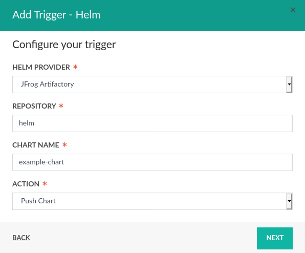 To add a new Helm trigger, navigate to Codefresh Pipeline Configuration view and expand Triggers section. Press the Add Trigger button and select the Helm trigger type to add.