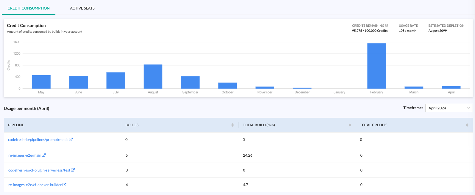 This table provides build and credit consumption metrics by pipelines for the selected month.