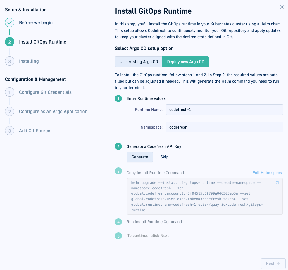Our new installation wizard, designed for ease of use and maximum visibility into every step, makes installing a GitOps Runtime simple, intuitive, and quick.