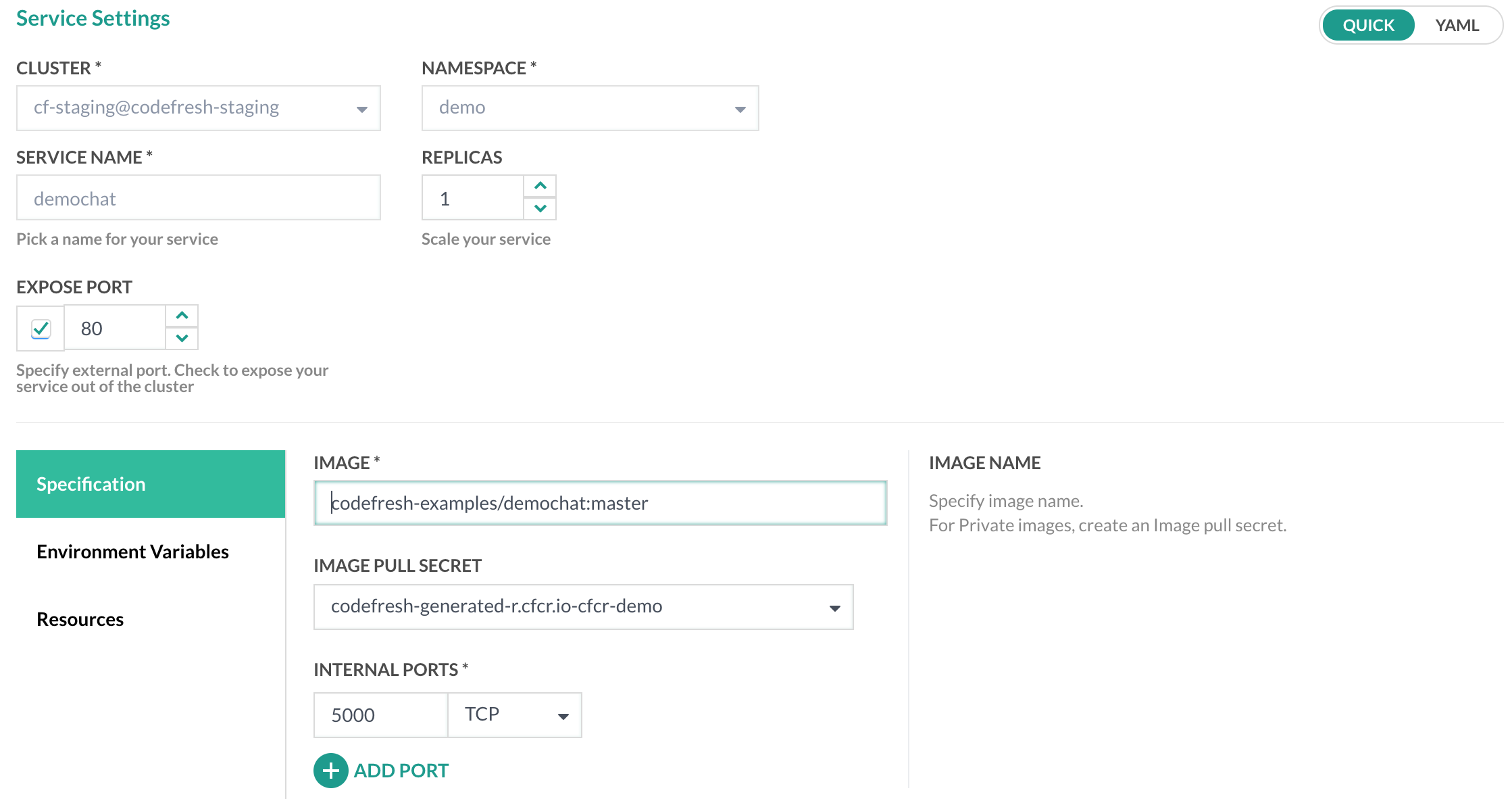 First you need a Docker image to deploy to the cluster. If you don’t have one already you can use a Codefresh pipeline to build one.