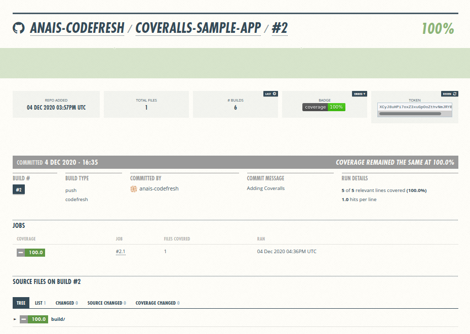 You can view the updated coverage reports within Coveralls UI every time you make a commit and/or run the Codefresh pipeline directly.
