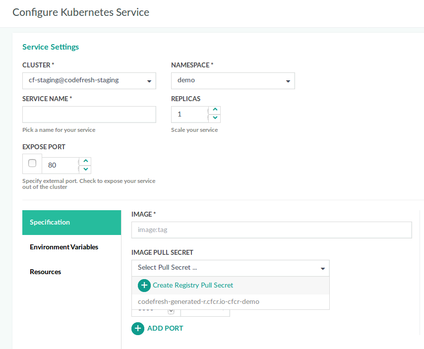 From now on, the cluster in this namespace can deploy Docker images from the selected registry. To apply the changed secret, you don’t really need to finish the deployment. Feel free to close the screen and go to another Codefresh page.