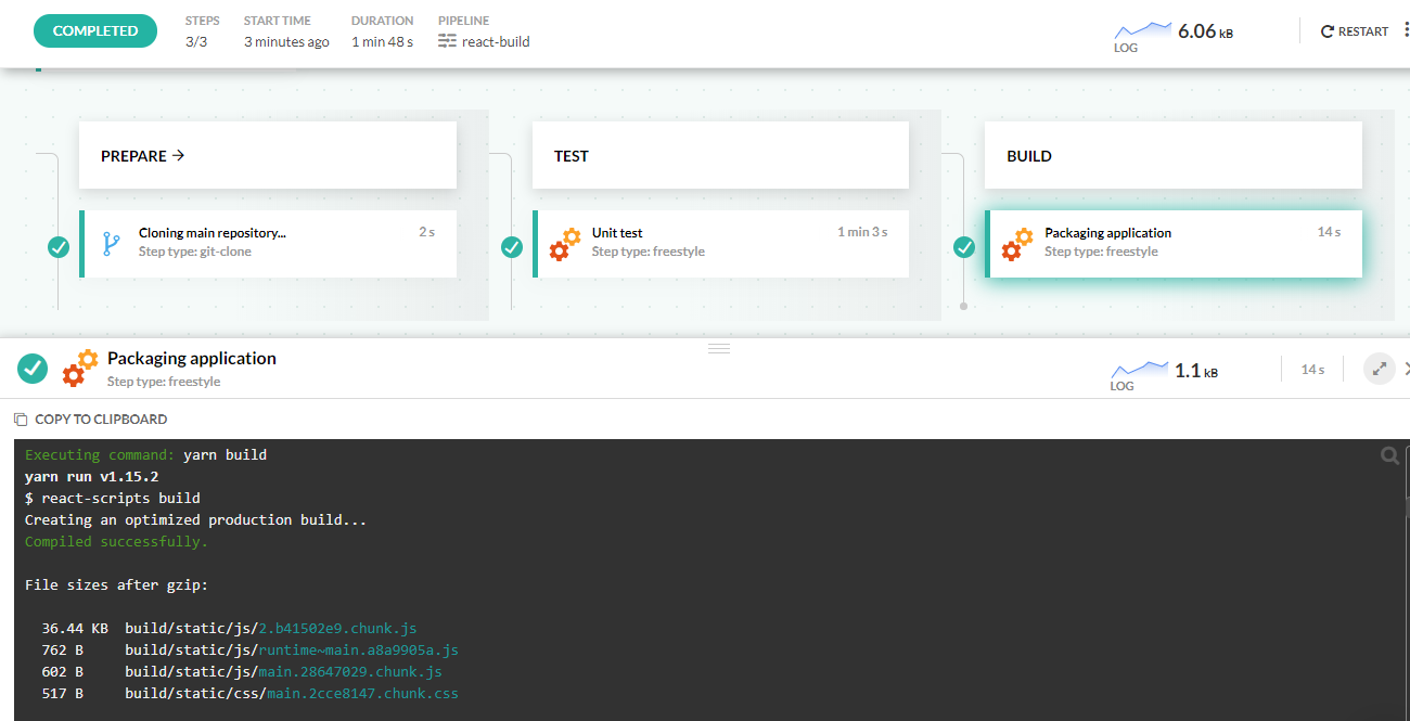 - yarn buildNotice that for demonstration purposes we uses node 11 for the tests, and node 8 for the packaging. Normally you should use the same version of node/Yarn for all your steps, but Codefresh pipelines are flexible on version of tools.