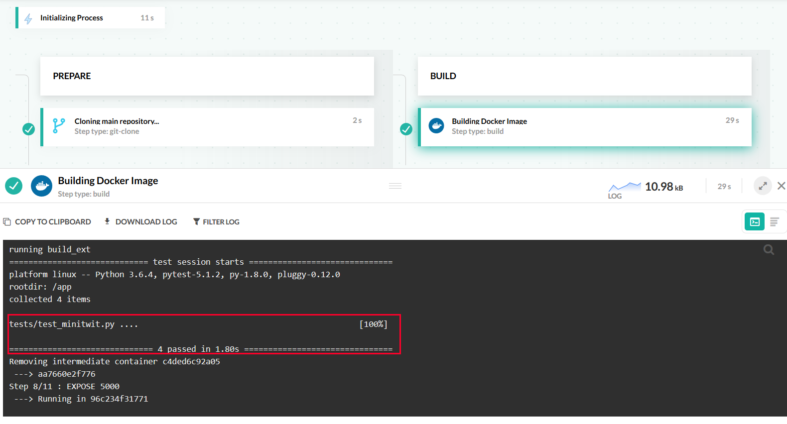 A big disadvantage of this unit testing method is that getting reports from the Docker image is not a straightforward process. On the other hand, such unit tests are very easy to integrate in any workflow. The Codefresh pipeline simply checks out the code and builds a Dockerfile.